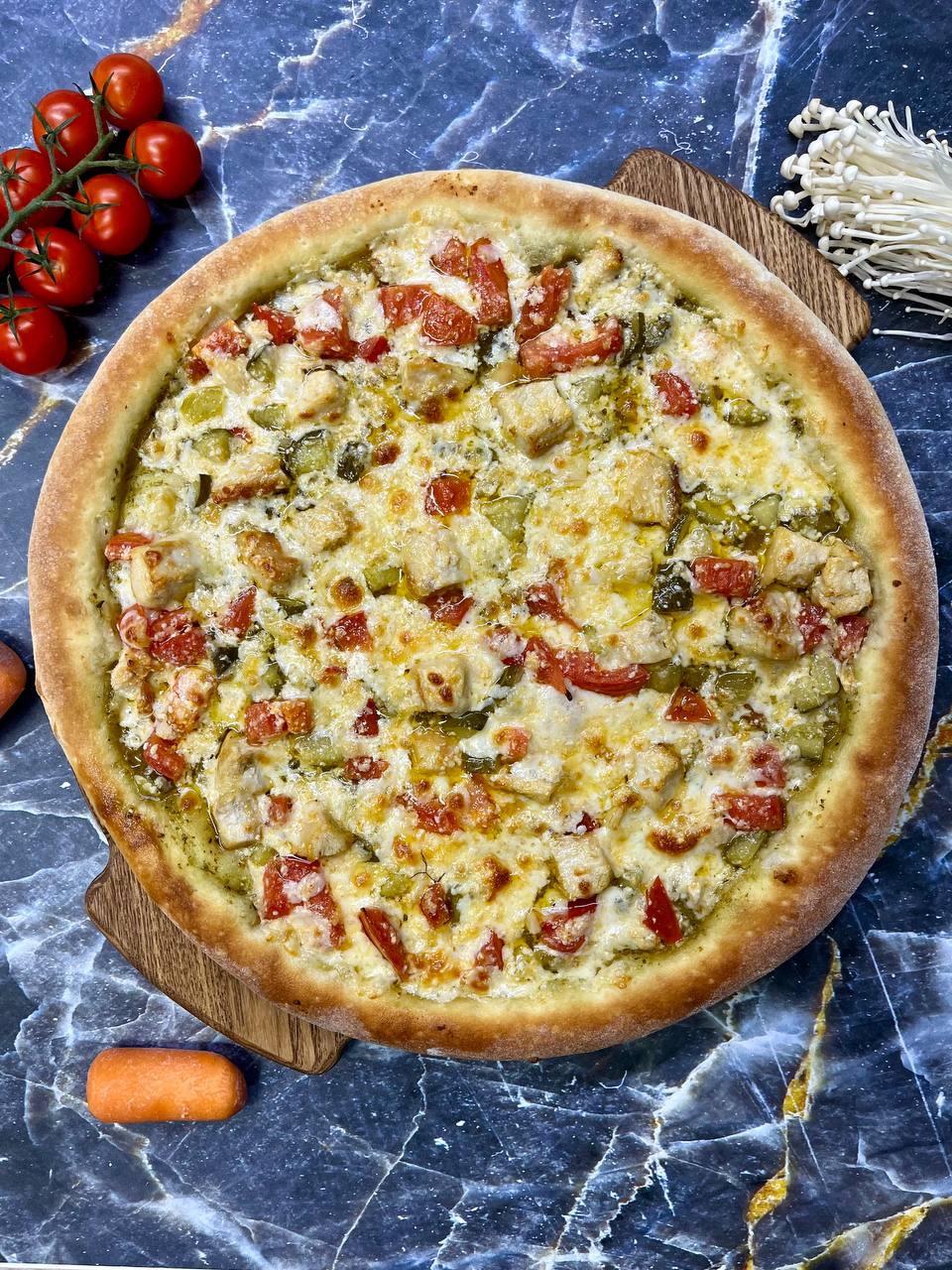 Соус песто, томаты, огурцы маринованные, курица, сыр моцарелла, чесночное масло.